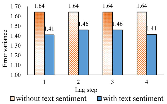 Then we compare the EV. According to Figure 5, when the text sentiment is not used, the EV is 1.64 regardless of the lag order of the web information sentiment, and the error variance decreases by about 0.2 after using the text sentiment, suggesting that, after using the text sentiment, the stability of the prediction is improved, indicating that the web text information plays a role in stabilizing the prediction results and correcting them. Furthermore, it can be found that the degree of lag is not particularly significant to the stability of oil price predictions.