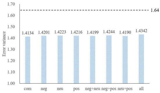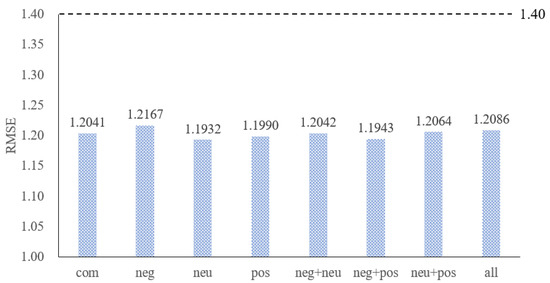 Comparison of RMSE among different types of text sentiment. Notes: “com” means adding , “neg” means adding , “neu” means adding , “pos” means adding , “neg + neu” means adding and , “neg + pos” means adding and , “neu+pos” means adding and , “all” means all join, “1.40” is the predicted result when no sentiment is added.