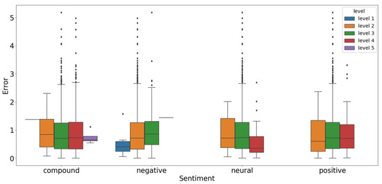 For the negative sentiment, Levels 1 to 5 in Figure 8 and Table 7 correspond to the intervals [0, 0.2), [0.2, 0.4), [0.4, 0.6), [0.6, 0.8), and [0.8, 1], respectively. When is at Levels 2 and 3, more bad cases will appear, that is, there will be many extreme error points. In contrast, at Level 1 they are fewer in number. The proportion of bad cases at Level 3 is the highest, the points at which the error is greater than 2 account for more than 10% of all points at this level, and that with an error greater than 5 may still be found, indicating extreme error. Compared with Level 3, which has higher support, this is much better: there are more data points at Level 2, but the proportion of bad cases is relatively small, indicating that the text tends to have the effect of correcting extreme errors. In terms of comprehensive performance, the degree of support at Levels 4 and 5 is too low to be considered. The average error at Level 3 is the highest, while those at Levels 2 and 1 are successively smaller. The average error at Level 1 is only 0.55, a decrease of about 50%, compared to the highest of 1.02, indicating that when is in a larger or smaller position, is more conducive to oil price forecasting.