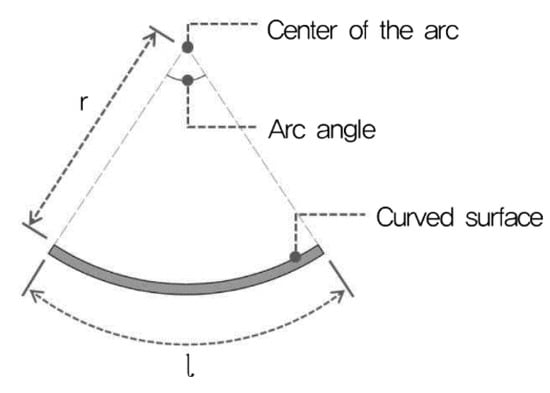 The effect of the reflector curvature on the performance of a light shelf was evaluated in this study, and thus, the curvature value of the reflector was an important index value in this study. We introduce the concept of an arc angle to quantify the degree of curvature of the reflector. As shown in Figure 5, the arc angle can be derived based on the center point of a circle when creating a circular arc with a length of ɭ on a circumference with a radius r. In this study, arc angles were determined as a function of the curvature of the light shelf using AutoCAD. The variables for evaluating the performance of a curved light shelf are summarized in Table 3. Arc angles from 0°–100°, in increments of 20°, were considered. However, only the performances of concave-upward light shelves were evaluated in this study, as concave-downward light shelves may not be suitable for introducing light into rooms (Figure 6).