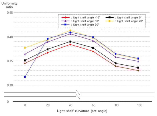 To create a pleasant indoor lighting environment, it is important to maintain optimal illuminance and uniform distribution of illuminance [20]. Therefore, the performance of a curved light shelf was evaluated in this study by calculating the uniformity ratio, a measure of the uniformity of indoor illuminance.