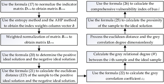 After obtaining the index weights, the combination of TOPSIS algorithm and gray relational analysis algorithm are used to solve the bus comprehensive vulnerability index and use it as the bus weight of the optimal D-PMU placement problem (). The solution steps are as follows:
