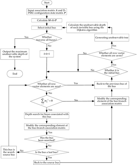 When multistage D-PMU placement is configured based on unobservable depth, the first stage should make the unobservable depth of the system not more than 2, the second stage should make it not more than 1, and the third stage should make the system is observable completely, the unobservable depth is 0. The flow chart of the optimal D-PMU placement is shown in Figure 3.
