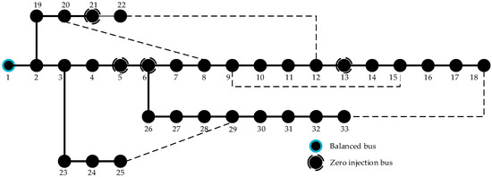 The topology of the IEEE 33 bus system is shown in Figure 8. 1–33 are the bus numbers. In the case of this paper, bus 1 is a balanced bus, buses 5, 6, 13, 21 are zero injection buses, and other buses are PQ buses.