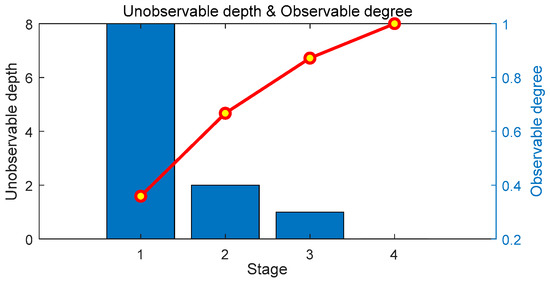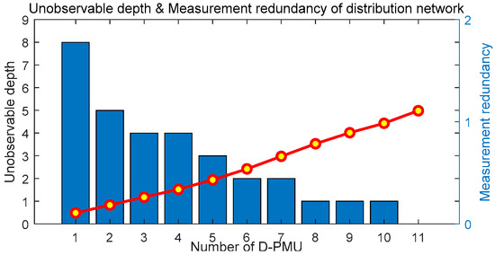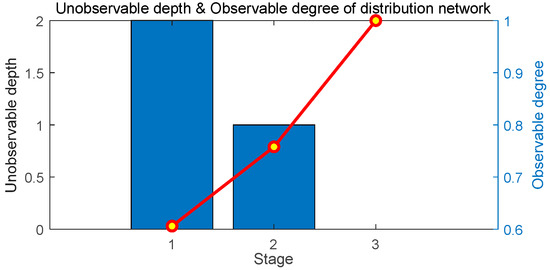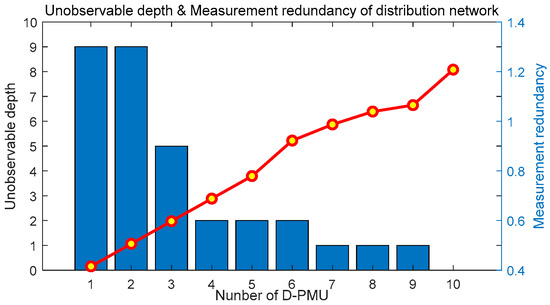 On the basis of the one-time optimal D-PMU placement scheme, the multistage optimal D-PMU placement without considering zero injection buses is realized. The details of the placement scheme are shown in Table 5. The unobservable depth and observable degree of each stage are shown in Figure 10, and the change of the unobservable depth and measurement redundancy of the system with the number of D-PMU placement are shown in Figure 11.