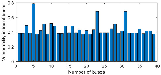 According to the bus vulnerability index determined in the previous section, the objective weights of the four indicators D1~D4 are obtained by entropy method: δ11 = 0.0588, δ12 = 0.4702, δ13 = 0.4127, δ14 = 0.0712, the subjective weights are obtained by analytic hierarchy process method: δ21 = 0.0675, δ22 = 0.5645, δ23 = 0.1845, δ24 = 0.1845. Based on the combination of objective weight and subjective weight, the combined weights of the four indicators are δ1 = 0.0627, δ2 = 0.5138, δ3 = 0.2965, δ4 = 0.1270. Then use TOPSIS algorithm and gray relational analysis algorithm to solve the bus comprehensive vulnerability index. The vulnerability index of each bus is shown in Figure 9.