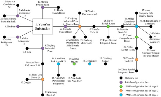 Some scholars have studied multistage optimal PMU placement. In [23], the segmentation iterative method was used to study the optimal placement of PMUs. It is assumed that all buses are equipped with PMUs, and a three-stage iterative algorithm is used to eliminate the buses that are not required to realize complete observability. Reference [24] proposed a multistage optimal PMU placement method that considers measurement redundancy, and divided the optimal PMU placement into two stages. The first stage ensures that the system is observable completely, the second stage guarantees that doesn’t lose the ability to observe the system in the case of branch N-1 failure. The above two methods are also aimed toward a one-time configuration to realize complete observability, which can be applied to a smaller system, but when applied to a large-scale distribution network system, the economy is still poor.