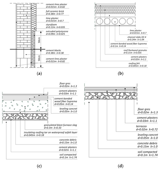 Figure 2 shows the thickness and the value of the thermal conductivity coefficient of each layer that constitutes part of the building envelope. The thermal conductivity coefficients are taken from PN-EN ISO 6946 [37].