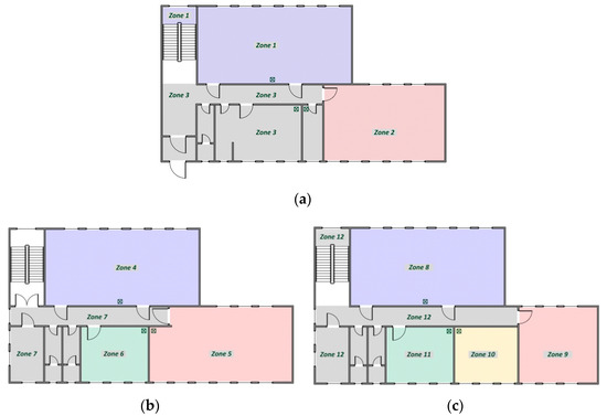 Heating zones in the case study building: (a) the ground floor plan; (b) the first floor plan and (c) the second floor plan.