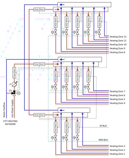 The heating system in the SKNX and EIEE Laboratory building is designed in such a way that it is possible to estimate the heat consumption in each room and implement various control algorithms as well as to measure, record and visualize useful data [39]. Panel radiators are used as the heating devices. In this system heat is carried by water supplied from the city heating network. The scheme of the pipeline system is shown in Figure 4. In order to force the water flow through the installation, circulation pump (P) is used. At the inflow, a control valve (CV) has been mounted and heating water parameters are measured using a heat meter. Then, the hot water flows into three main circuits assigned to each story and the heating water parameters are also measured at the inflow to each circuit. The water feeds heating circuits assigned to heating zones (Figure 3): on the ground floor—three circuits, on the first floor—four circuits and on the second floor—five circuits. Water from heating devices returns through the pipelines on the stories and then the main pipeline to the city heating network. Each water circuit is equipped with a heat meter and a KNX servo drive. The servo drives are controlled by signals sent directly from the KNX bus. The KNX multi-function push-button with a room temperature control unit is located in each heating zone. In addition, the KNX Laboratory (heating zone 5) is equipped with a KNX touch panel that visualizes the states and parameters of the system. A valve controller at the heating system inflow and heat meters is connected to the ControlMaestro controller with a SCADA (superior control and data acquisition) system using an M-Bus network (Figure 4). This system allows the visualization and acquisition of values measured in the building heating system.