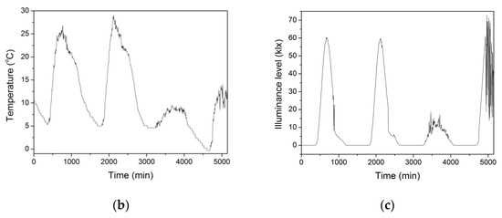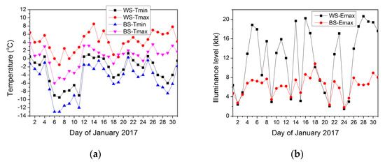 Data measured in January 2017 by the weather station WS and the brightness and temperature sensor BS: (a) the lowest and highest temperature and (b) the highest daylight illuminance level.