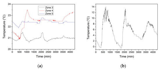 Impact of changing the heating system operating mode on the temperature inside the building. Temperature from 0:00 on 10 April to 24:00 on 12 April: (a) in the heating zones and (b) outside the building.