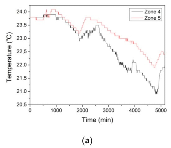 On 8 April, the daytime temperature dropped below 10 °C and then to around −1 °C at night. This resulted in a lower room temperature, more significant in zone 4. On 9 April at 9:40 (4900 min) the windows were closed in both zones, the heating system turned on and the temperature started increasing to the set point value. It should be noted that tilting of only one window in the room led to a temperature decrease of around 3 °C during the considered time, which corresponds to the weekend time.