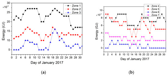 Energy consumption in the heating zones on days of January 2017, measured by the heat meters, is shown in Figure 9, and Table 2 presents the measured and calculated energy consumed over the whole month. The results were obtained with no heating control and the actual room temperatures were equal to the temperature set points. The occupants had the freedom to choose the temperature set points and, as can be seen in Table 2, the range of the selected set points was wide: from 19 to 24.5 °C. It reveals a strong influence of individual occupant preferences on the feeling of comfort.