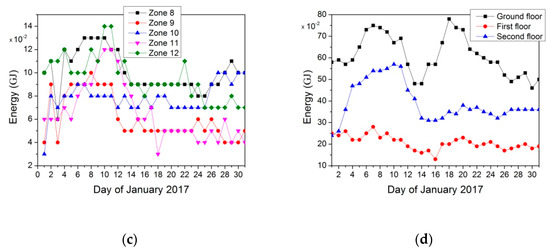 Energy consumption on days of January 2017 measured with heat meters: (a) in heating zones 1–3; (b) in heating zones 4–7; (c) in heating zones 8–12 and (d) on the stories of the building.