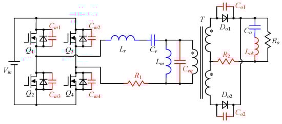 However, in practical applications, the parasitic components of the LLC resonant converter have a significant impact. The secondary-side parasitic capacitance may influence the ZVS transient in the LLC resonant converter []. The transformer capacitance may have an impact on the conduction loss of primary-side switches, and the optimal dead time should be longer [,]. In the LLC converter with center-tapped transformer, unbalanced leakage inductances may cause the imbalanced rectifying currents [,]. At the switching transitions, the voltage oscillation across rectifier diode may emerge by the transformer leakage inductance and the parasitic capacitance [,]. The practical phenomena that the output voltage is unregulated at light load condition cannot be explained by the ideal analysis. The essential reason may be the effect of junction capacitances of rectifier diodes, or the output capacitances of primary-side switches [,,].
