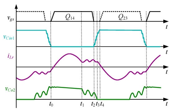 The most common control strategy for LLC resonant converters is variable frequency control with half duty ratio. To make sure the converter is operating in the ZVS region, the switching frequency is usually lower than the resonant frequency. The circuit waveforms are shown in Figure 2, including the driving waveform vgs, the voltage vCin1 across the switch Q1, the resonant current iLr, and the voltage vCo2 across the rectifier diode Do2.