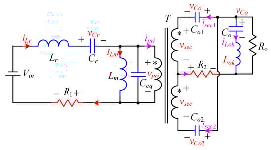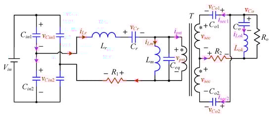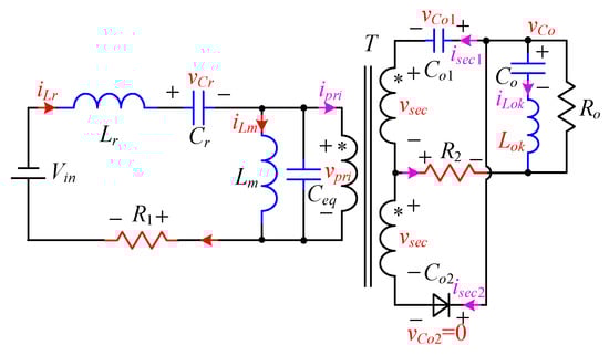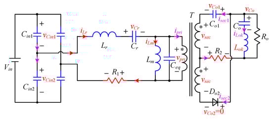 The differences from Figure 7 to Figure 5 are the voltage of the input side of the resonant network becomes –Vin, and the change rates of vCin1 and vCin2 are both zero. The differences from Figure 7 to Figure 6 are vCo2 is clamped to zero, and Do2 is conducting forward. Then, the matrix form of differential equations of the negative resonant stage can be easily listed as Equation (A6) in the Appendix A.