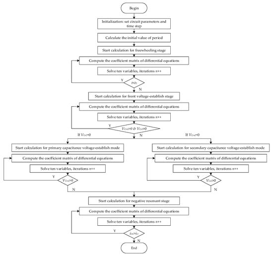 Calculate the numerical solution of the differential equations in MATLAB, and Figure 8 shows the flow chart processes of the four stages after the positive resonant stage. The converter parameters and the voltage and current values at time t1 are set at the initialization. Choose two different operating points of the LLC resonant converter to calculate, which correspond to the two kinds of modes. Then, draw the waveforms with changing time as shown in Figure 9 and Figure 10.