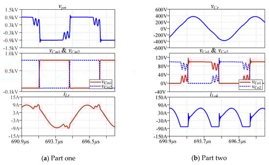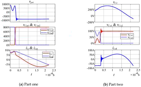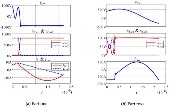 In Figure 9, vCo2 drops to zero first, while in Figure 10, vCin2 drops to zero earlier. Besides the resonance between Lr and Cr, there are two other oscillations in the waveforms of the numerical solution.