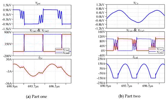 LTspice software is used to verify the theoretical analysis for it has the advantages such as being free, fast, and easy to converge. And the mathematical model of SiC devices can be imported to LTspice directly. The junction capacitance of the rectifier diode can be represented as a variable current source controlled by variable voltage. To simplify the simulation, the open-loop waveform is simulated with unique driving signals. The LTspice simulation waveforms corresponding to the two kinds of modes are shown in Figure 11 and Figure 12, respectively.