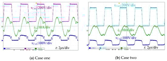 The experimental results of the LLC converter are shown in Figure 14. In case one, the time interval of the freewheeling stage is longer. And iLr and vCo2 are oscillating at a frequency higher than the resonant frequency of the LLC converter. vCo2 drops to zero first, and then vCin2 drops to zero. When the rectifier diode is conducting forward, there is high-frequency oscillation in the beginning of the resonant stage. It is corresponding to the numerical solution and the simulation results. In case two, the time interval of the freewheeling stage is shorter and less than a resonant period. vCin2 drops to zero a little earlier than vCo2. The spike of high-frequency oscillation in the waveforms of diode voltage is a little larger than that of case one.