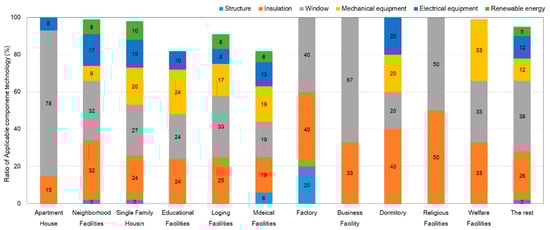 Figure 1 [] shows the survey results of green retrofits, which exhibit the current status of applicable component technologies per building purpose. Among the component technologies, the replacement with high-performance windows accounts for 38%, which is the highest, followed by insulation reinforcement at 26%. As shown in this figure, windows, insulation, and light-emitting diode (LED) light replacement are the general methodologies used currently as component technologies to save energy during a retrofit.