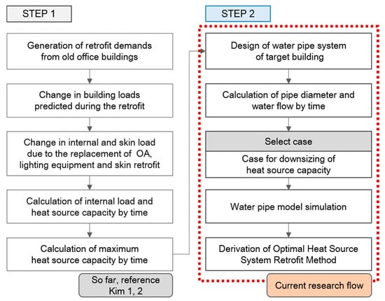 The process for the reduction in CO2 emissions and energy-saving measures in existing office buildings is generally as follows []. First, the energy consumption status and characteristics of buildings are identified to determine when, where, how, and for which purpose energy is consumed. Then, effective measures according to the building energy characteristics are adopted and executed in timely manner. After this, the plan → do → check → action (PDCA) cycle is iterated to conduct building operations. Figure 2 shows the diagram of research process. To determine the energy consumption of existing buildings, previous studies were referenced [,]. The change in the internal heat gain was quantitatively verified per year using [], and the energy consumption status of the entire building was determined using minutesecond12]. Accordingly, the present study conducted a replacement of a heat-source system during a retrofit according to changes in the heat-source capacity based on the previous study [] where the maximum cooling and heating loads were quantitatively studied according to the execution of an envelope retrofit on the basis of Step 2 in Figure 2.