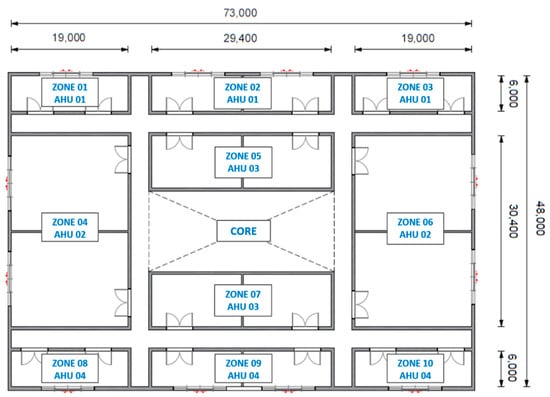 Based on the study results by [], the completion date of the target building was 1985, around 30 years ago, and the building was set up using the large office reference model of EnergyPlus []. The detailed overview of the building is presented in Table 1. Figure 3 shows the typical floor of the target office. The cooling and heating area was set to occupy 60% of the total floor area based on the study result by [].
