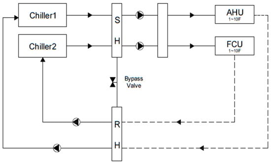 As for the energy consumption per equipment of chiller systems using two chillers, the information presented in Table 4 was used []. The energy consumption by the pumps in the HVAC system accounted for about 20% of the total consumption annually. Since the change in the flow rate due to the change in cooling and heating loads in the HVAC system influence the pump power, it is necessary to quantitatively verify the change. Thus, this study configured the HVAC system as shown in Figure 4, and adopted a system that controlled the flow rate during cooling and heating according to the opening of a bypass valve. In addition, pipes in the system were connected in parallel to identify the correlation of pump power, pipe diameters, and flow rate with regard to two in-line circulation pumps, which were interoperated with the absorption chillers and heaters.