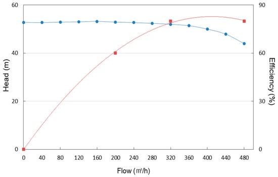 The pump for circulating the cooling and hot water was a single-stage in-line type, and the head of fluid and pump was set to about 50 m considering the height of the target building. Figure 5 shows the pump head and efficiency, in which the rated power was 90 kW, the flow rate was 160–480 m3/h, and the head was 44 to 53.2 m.