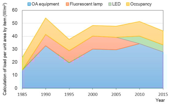 This study aimed to determine the current status of building loads in Korea and to reflect the actual retrofit level based on the current status. To do this, this study identified the detailed status of large office buildings through literature reviews [], and quantitatively summarized the changes in internal loads, such as the office automation (OA) equipment load and the heat load from occupants, as well as the building skin loads due to architectural design standards. Reference [] examined the device-specific catalog of elements for each year of internal load and quantitatively showed the variation of internal load. The result is shown in Figure 6, Figure 6 shows the changes in power consumption of OA equipment, and lighting fixtures (fluorescent light and light-emitting diodes (LED)), and heat loads from occupants for the past 30 years. The OA equipment load in 2015 increased by about 49.6% compared to that in 1985, and the lighting load decreased by about 47% due to the replacement with LED light.