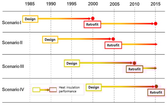 About 36% of global energy consumption is attributed to residential and commercial buildings (41% in Europe, 34% in the USA, 34% in Japan, and 24% in Korea) []. Thus, steady research and development of methodologies to reduce energy consumption in buildings have been conducted. South Korea has strengthened insulation standards for new buildings to meet a passive house level, which has been used in Germany since 2017, and has encouraged low-consumption energy buildings by using policies such as green building certification and energy efficiency ratings, etc. []. Moreover, the energy reduction in existing buildings, which account for about 97% of all buildings, is also very important and has, therefore, been studied under the name of “green remodeling” []. The retrofit ratio of the buildings in the permit area from 2002 to 2012 amounted to about 20% [], among which green remodeling was concentrated mostly in residential buildings []. In addition, the survey result of building completion year showed that the number of buildings completed between 1991 and 2000 was 8735, which was the largest, followed by buildings between 1981 and 1990, exhibiting that most buildings were completed from 10 to 30 years ago.