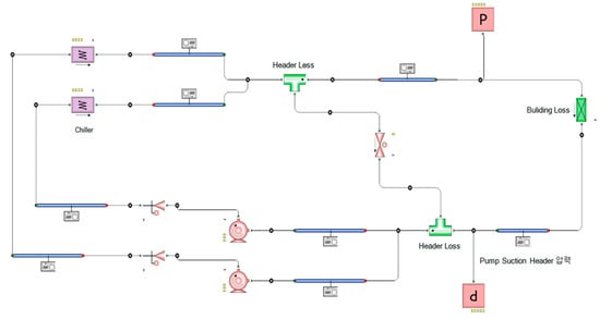 Figure 8 shows the construction of a simulation model of the HVAC system in this study using the FloMASTER V8.0 program components. Since this study limited to the scope to the water pipes and the transportation pump in the primary heat-source system, the loss portion of flow rate in the building, and pressure due to the head were re-produced using the components for the secondary load. The HVAC system reproduced in FloMASTER V8.0 reflects Figure 4 and Figure 5, and is targeted at the system in relation to Figure 3. Configure the water flow rate and pipe diameter for the design conditions in Table 3, the instrument specifications in Table 10, and the RTS-SAREK results in Table 11, Table 12 and Table 13. The details of each component function are described in Table 14.
