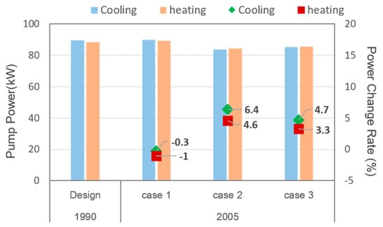The simulation results exhibited that Case 2, which employed the downsizing of heat-source equipment while using the existing water pipes, was found to obtain the most substantial power reduction in transportation pump out of four scenarios. Energy was saved by about 10%, and the power of the transportation pump was also reduced when the maximum load was reduced by the retrofit conducted after the insulation performance standards were reinforced.