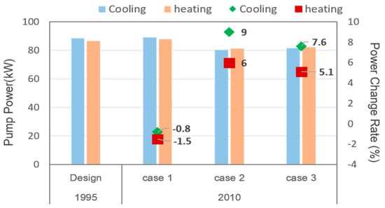 In Case 1, because the maximum load was reduced due to the retrofit, the actual flow rate was 60% to 65% of the maximum flow rate of the absorption chiller and heater. This meant that the heat-source equipment operated at partial-load conditions even at the time of maximum cooling and heating, leading to the reduction in energy usage. In Case 2, the downsizing of the heat-source equipment was applied reflecting the reduction in the maximum cooling and heating load, but existing pipes were utilized. Thus, the water-pipe system is a case of oversizing operations overall. The actual flow rate was around 90% of the maximum flow rate of the heat-source equipment and pump power was reduced by around 10% due to the reduction in flow velocity. Case 3 refers to a replacement of both the equipment capacity and pipe diameter with appropriate sizes due to the reduction in maximum load. It was determined in response to the maximum load. The power of the transportation pump was reduced by about 10%, which was similar to that of Case 2.