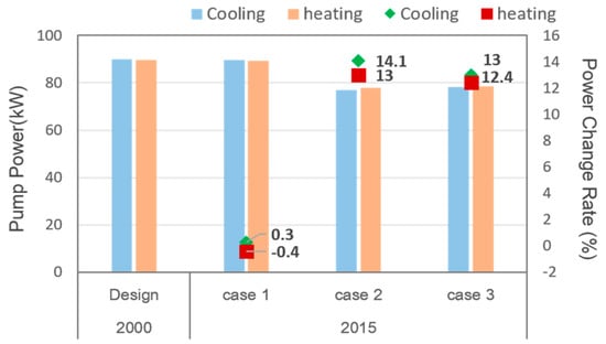 Figure 9, Figure 10 and Figure 11 show the simulation results of the transportation pump for each scenario. Scenarios 2 to 4 showed a similar trend as Scenario I. That is, the power of transportation pump was reduced in Cases 2 and 3. This was because the flow velocity was decreased due to the reduction in the flow rate compared to the pipe size in Case 2, and the pump power was decreased as a result of using equipment of proper capacity in Case 3.