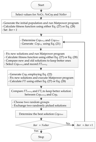 OCOA was inspired from the natural behaviors of coyotes. The strange characteristics of OCOA are two new solution generation techniques and one more technique for exchanging solutions among groups. OCOA is totally different from other metaheuristic algorithms since the whole population is divided into a number of groups (NoGr) and there is a number of members in each groups (NoCoy). Each coyote is represented by its social condition and quality of the social condition. Between the two factors, the former is corresponding to the optimal solution and the latter is corresponding to the fitness function value of the optimal solution. OCOA executes two techniques for producing two new solution times. OCOA produces (NoGr × NoCoy) solutions in the first time but OCOA produces NoGr solutions in the second time. It is noted that the result of (NoGr × NoCoy) is also population size. All solutions in each group are newly updated in the first technique while only one solution in each group is newly updated in the second technique. At the last step of OCOA, two randomly picked solutions in two randomly chosen groups can be exchanged based on a predetermined condition. Therefore, it seems to be that OCOA is a promising method for the considered OPF problem. For better understanding of OCOA, the whole computation steps of OCOA method are described in detail as follows [39]: