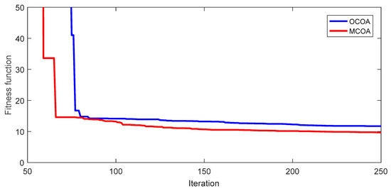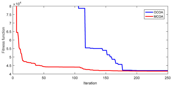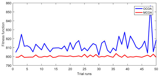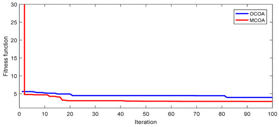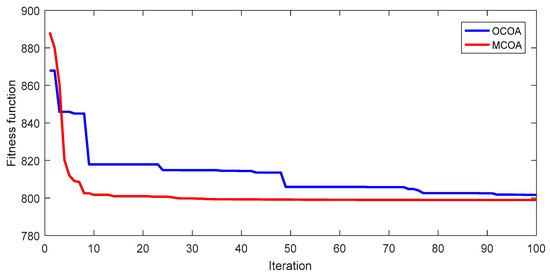 As shown in Equations (21) and (22), MCOA experiences two generations of new solutions. Therefore, there have to be two times for checking the violation of new solutions and correcting new solutions. Each new solution is comprised of Pk,i (k = 2, …, NoG), Vk,i (k = 1, …, NoG), Tt,i (t = 1, …, NoT), and SVCc,i (c = 1, …, NoSVC). Therefore, these variables must be checked and corrected by using the following formulas: