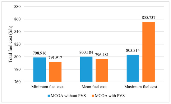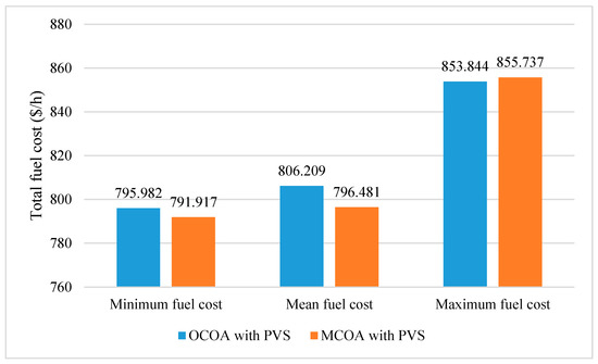 After determining all control variables as shown in Equations (23)–(26), such control variables are sent to input data of the Matpower program for execution and obtaining other dependent variables such as P1,i, VLl,i, Qk,i, and MVAbr,i. As a result, quality evaluation of the ith solution is completed by calculating the fitness function. In the paper, two independent optimization cases are considered to be reduction of electricity generation fuel cost and the reduction of total active power losses. According to the two cases, the fitness function is mathematically modeled as follows:
