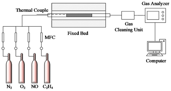 The experimental setup for catalytic testing is shown in Figure 1. Ten grams of each sample was placed in a fixed-bed quartz tube reactor (i.d. = 20 mm) which was externally heated by a temperature-controlled furnace. Gas flow rates were controlled by mass-flow controllers (MFCs, MF SHY 400, SHY company, Suzhou, China), with the simulated gas mixture regulated to 500 ppm NO, 500 ppm C2H4, 3.0 vol.% O2 and N2 as the balance flow with a total flow rate of 1500 ml/min. Gas mixtures were injected into the reactor after catalyst temperatures reached a stable set point for each test. Inlet and outlet gas concentrations of NO and NOX were analyzed by a flue gas analyzer (MRU, NOVA Plus, Heilbronn, Germany). From these data, the catalytic activities were calculated according to the following equation: