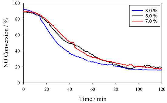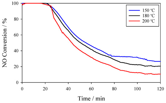The NO conversion data versus time at different temperatures are shown in Figure 2 while using the 3Mn/NAC catalyst. It was used to provide baseline data that could be compared with previously published data [39]. Nearly 100% NO conversion occurred during the first 20 min at all temperatures (150 °C, 180 °C and 200 °C), but it suffered rapid declines after this initial period and showed less than 20% conversion after 2 h of testing. The temperature dependence of the activity followed the order of 150 °C > 180 °C > 200 °C.