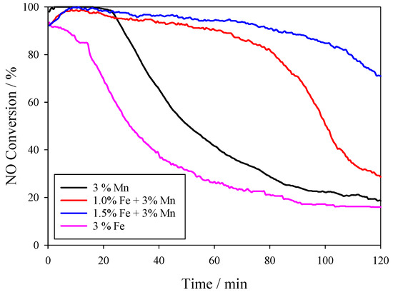 Figure 4 displays NO conversion data for the mono-metal oxides of 3Fe/NAC and 3Mn/NAC, and the bimetallic oxides 1.5Fe3Mn/NAC and 1.0Fe3Mn/NAC versus time at a 150 °C reaction temperature. The bimetallic oxide catalysts had high initial activity and significantly better conversion maintenance than did the mono-metal oxide catalysts. Some deactivation was still evident for the bimetallic oxide catalysts after 2 h, however, the improvement in longer-term performance was evidence for synergistic effects between the Fe and Mn species.
