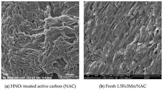 Surface morphologies of the catalysts were investigated by SEM and SEM-EDS to examine whether dispersion changes of MnOx and FeOx species were related to rapid conversion declines or maintenance. The SEM images of HNO3 treated AC, i.e., NAC without metal oxides, and of freshly prepared 1.5Fe3Mn/NAC in Figure 5 show readily accessible porous structures not noticeably changed as a consequence of incorporating the Fe and Mn oxides. In fact, as presented in Table 1, the surface areas and pore volumes of the NAC and metal oxide-containing catalysts were very similar to each other and near 650 m2/g and 0.4 cm3/g, respectively, before and after reaction testing (the as-purchased AC, before HNO3 treatment, had a surface area of 710 m2/g). Maintenance of the porous structure may have been beneficial for dispersing the active species or maintaining an effective pathway for access of reactants and products to and from the active sites; however, the surface areas and porosities of the mono-metal 3Mn/NAC also did not significantly change before and after reaction testing although its NO conversion activity rapidly declined after 15–20 min of testing. Hence, catalyst surface areas and porosities did not control NO conversion for these catalysts, in agreement with previous studies showing the surface area of supported MnOx catalysts was not a main cause of catalytic activity change during HC-SCR reactions [40].