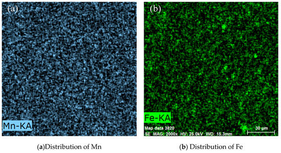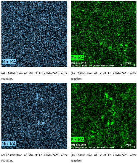 The SEM-EDS acquired Fe and Mn elemental distributions for 1.5Fe3Mn/NAC after reaction testing, as shown in Figure 8. Some agglomeration of Fe and Mn distributions can be found as compared to the distributions within the as-prepared catalyst in Figure 6. These Fe agglomerates are seen in the bright contrast areas on the catalyst surfaces toward the right and lower sides of the distribution maps. Agglomeration of Mn is also shown in Figure 8c but its extent is less than that observed for Fe. Hence, as compared to the EDS elemental distribution maps in Figure 6 of the as-prepared 1.5Fe3Mn/NAC catalyst, the EDS data from tested catalysts indicated more Fe and Mn agglomeration. These aggregates could represent agglomeration sites of the originally active catalytic components, and thereby greatly affect active site dispersion to cause rapid deactivation. However, although this agglomeration was less than that observed for MnOx species in previously published data on a reaction tested 3Mn/NAC catalyst [39], its activity had decreased to near 20% NO conversion after 120 min of testing whereas the activity of 1.5Fe3Mn/NAC at the same time was near 80% NO conversion. Thus, their presence did not significantly affect the catalytic performance but still cause a NO conversion drop during 2 h testing.