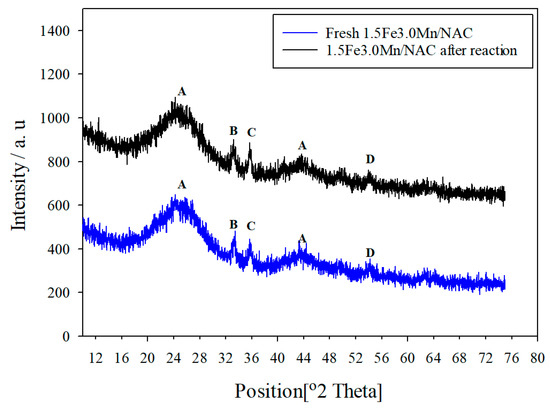 XRD data from 1.5Fe3Mn/NAC are presented in Figure 9 in which the main peaks have been identified. The broad peaks at 2θ = 24° and 2θ = 43° (labeled as A) are in agreement with those of amorphous carbon [41]; their positions and widths were the same in the fresh and tested catalysts, pointing to the stability of the NAC amorphous structure. Three other peaks at 2θ = 33.5°, 2θ = 35.1°, and 2θ = 54.3° (labeled as B, C and D, respectively) were present in both the fresh and tested catalysts, and were not significantly altered in position or peak intensities as a result of reaction testing. The peaks at 2θ = 33.5° (peak labeled as B) is attributed to Fe2O3 [42] and peaks at 2θ = 35.1° and 54.3° are attributed to Fe3Mn3O8 [43]; although the intensities and widths of these Fe-related peaks were the same in the fresh and tested catalysts, it is rather difficult to determine whether Fe and Mn crystallinities have changed during testing because the XRD peaks are weak. Nevertheless, incorporating FeOx with the MnOx did cause the formation of Fe3Mn3O8 solid solutions which may be an active species in the FeOx-MnOx/NAC catalysts for NO conversion [43,44].