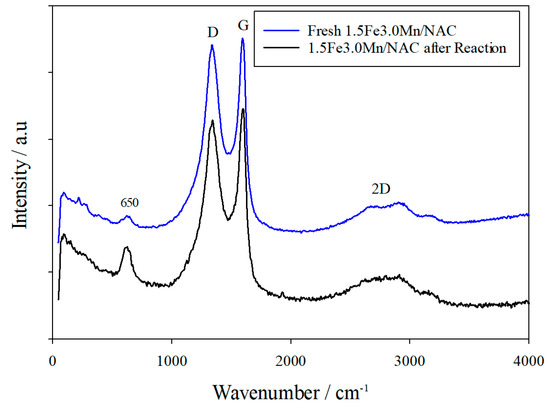 Raman spectra from 1.5Fe3Mn/NAC were also acquired before and after reaction testing, as shown in Figure 10. The spectrum of the fresh catalyst contained bands at 1360 cm−1 (labeled D), 1610 cm−1 (G) and triplet structured bands near 3000 cm−1 (2D); these are attributed to the activated carbon support [40] and are present with similar intensities in the reaction tested catalyst. A peak at 650 cm−1 in the as-prepared catalyst is attributed to Fe-O-Mn bond vibrations [45]; this band also was observed in the reaction tested catalyst but is narrower and higher in intensity. The narrowing of this band after testing suggests a higher degree of order or crystallinity in the Fe3Mn3O8 species than before testing. Increased crystallinity as a result of testing points to a reordering or redistribution of the FeOx and MnOx species, a result also suggested by the SEM-EDS data from the as-prepared and tested catalysts. This redistribution would decrease the availability of active catalytic sites and could cause decreased NO conversion at the longer reaction times near 2 h.