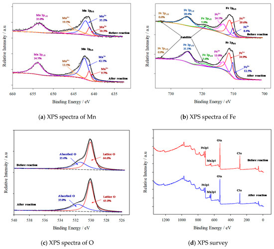 The XPS spectra of Mn2p, Fe2p, O1s and curve fittings to their peak envelopes of 1.5Fe3Mn/NAC before and after reaction testing are presented in Figure 11. The Mn spectra showed two main peaks at 641.6 and 653.3 eV, corresponding to Mn 2p3/2 and Mn 2p1/2, respectively [46]. For Fe, the peak envelopes were at 711.1 and 724.6 eV, corresponding to Fe 2p3/2 and Fe 2p1/2 and have multiple shoulders within their envelopes that signify more than one Fe species; their satellite peaks were at 719.1 eV and 733.3 eV [47]. The O1s peaks were asymmetric and were deconvoluted into two symmetric peaks at 530.0 and 531.8 eV; these were assigned to lattice oxygen and absorbed oxygen, respectively [46].