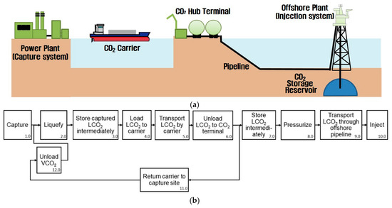 CO2 terminals have various forms depending on the connection methods between capture and storage sites [15]. Since the objective of this study was to demonstrate the basic configuration and operation concept of a CO2 terminal, a relatively simple form of a CCS chain was selected as a target system (Figure 2a). The concept of a CCS chain displayed in Figure 2 is identical to the 1-million-ton-scale demonstration project in Korea. This CCS chain liquefies captured CO2 at a thermal power plant located on the coast, and transports liquid CO2 (LCO2) to a CO2 terminal through CO2 carriers. CO2 is transmitted to an offshore platform through an offshore pipeline and injected into offshore geological formations.