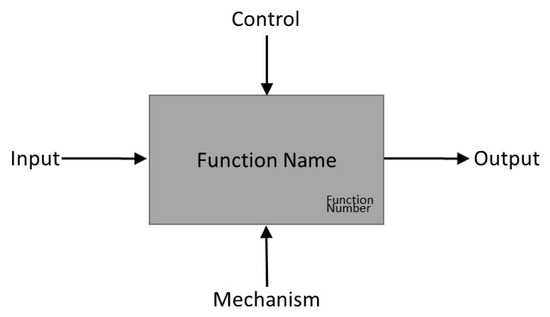 The IDEF0 diagram integrates the inputs, control, outputs, and mechanisms of functions. IEDF0 allows us to understand the correlation between functions derived from FFBD. In IDEF0, the block represents the function to be performed, and the left and right arrows show the input and output of the process, respectively. The up and down arrows indicate the controls and the mechanism of the function, respectively (Figure 3).